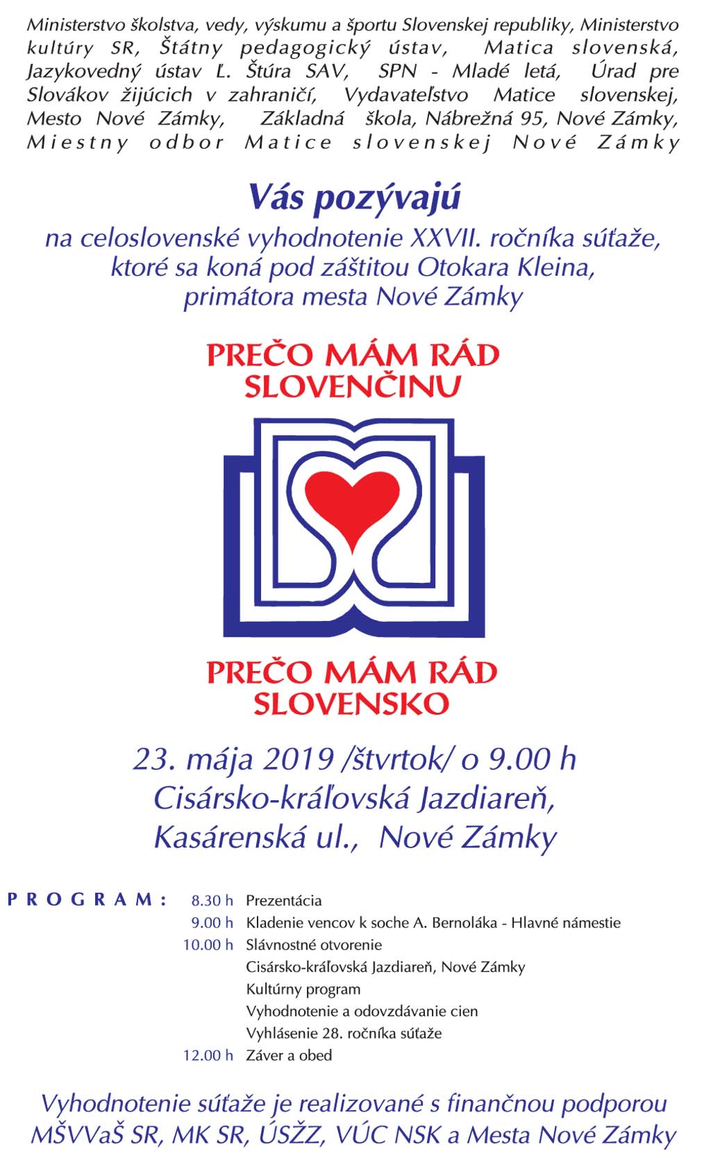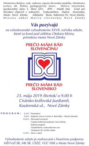 Vyhlásenie výsledkov 27. ročníka súťaže literárnych prác žiakov a študentov základných a stredných škôl zo Slovenska a zahraničia Prečo mám rád slovenčinu, prečo mám rád Slovensko sa uskutoční v Nových Zámkoch 23. mája 2019. Slávnostné vyhlásenie výsledkov súťaže je spojené s krátkym pobytom na Slovensku pre ocenených žiakov a pedagógov z radov krajanov.