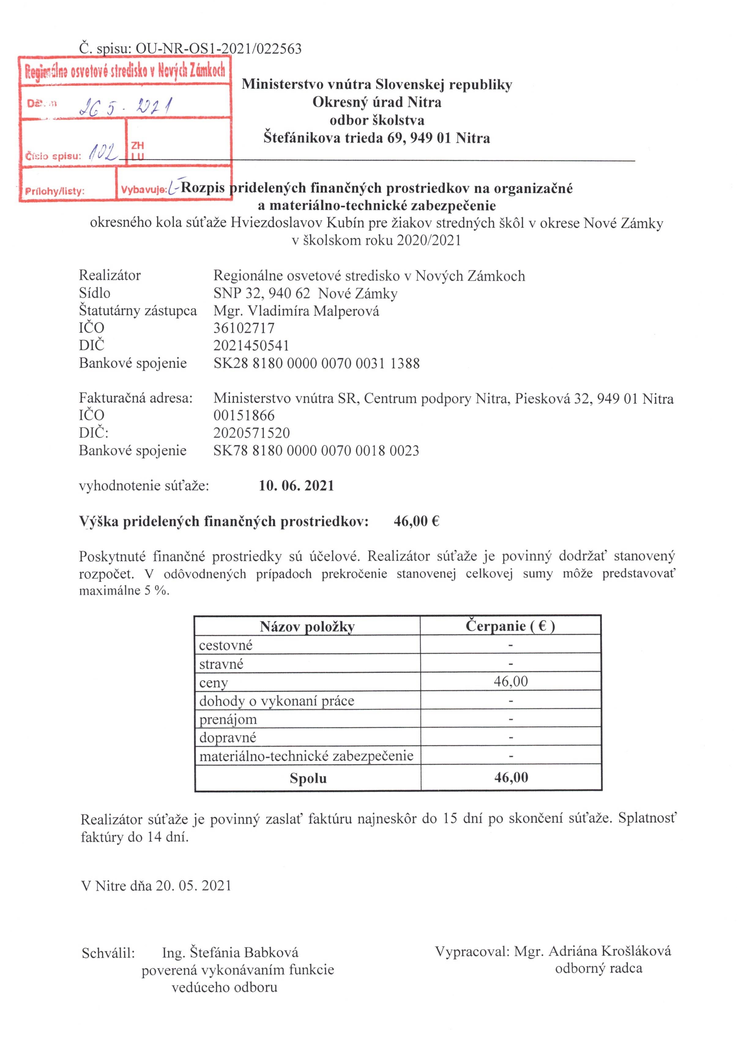 finančné prostriedky "Hviezdoslavov Kubín 2021" - IV. kategória žiakov stredných škôl v okrese Nové Zámky
