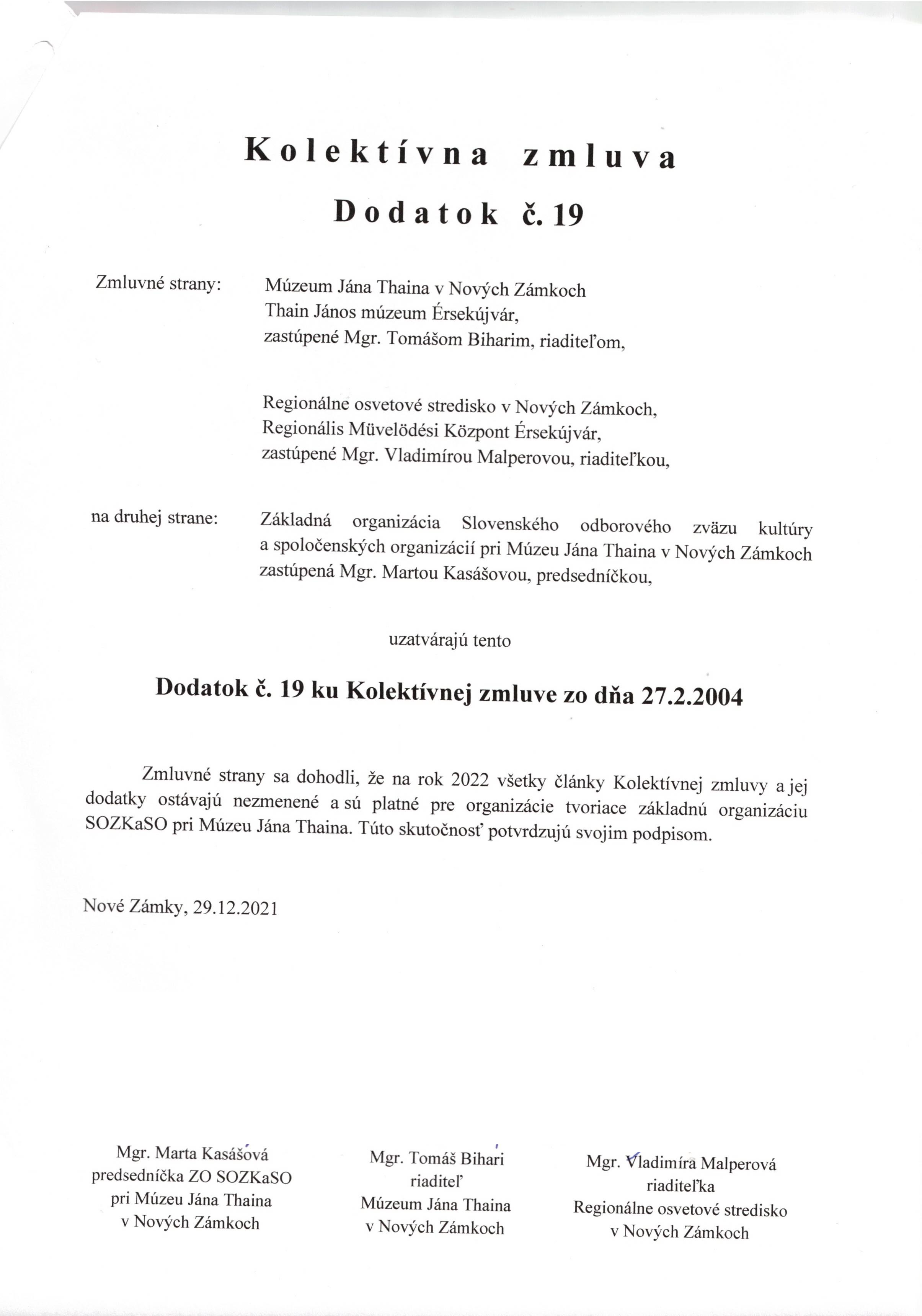 Dodatok ku kolektívnej zmluve č. 19