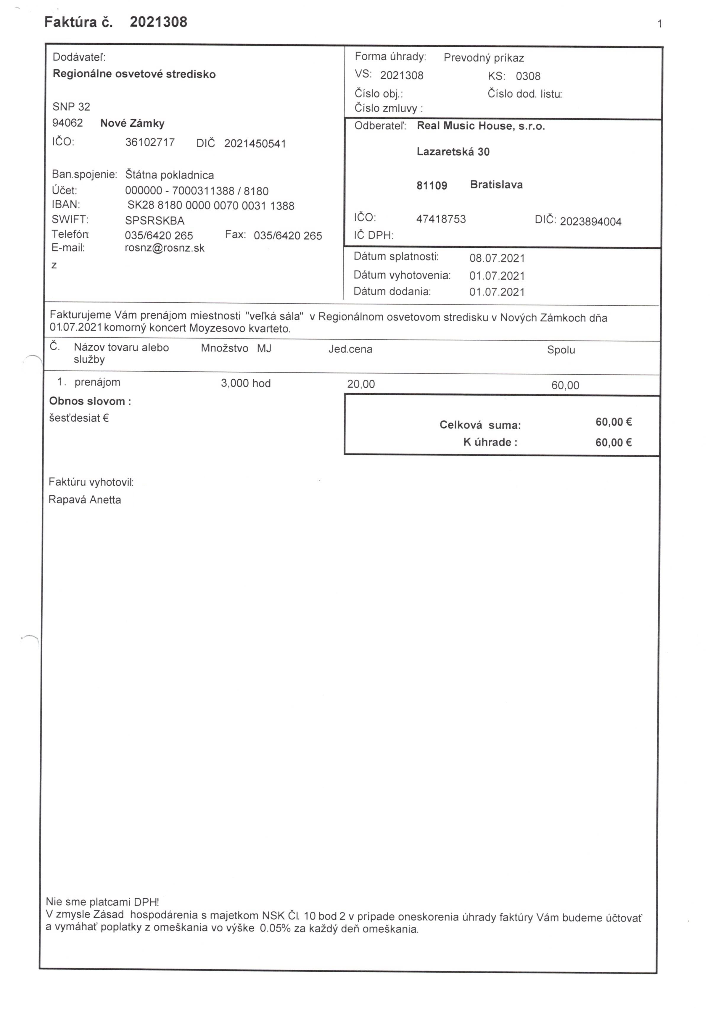 prenájom priestorov "Veľká sála"