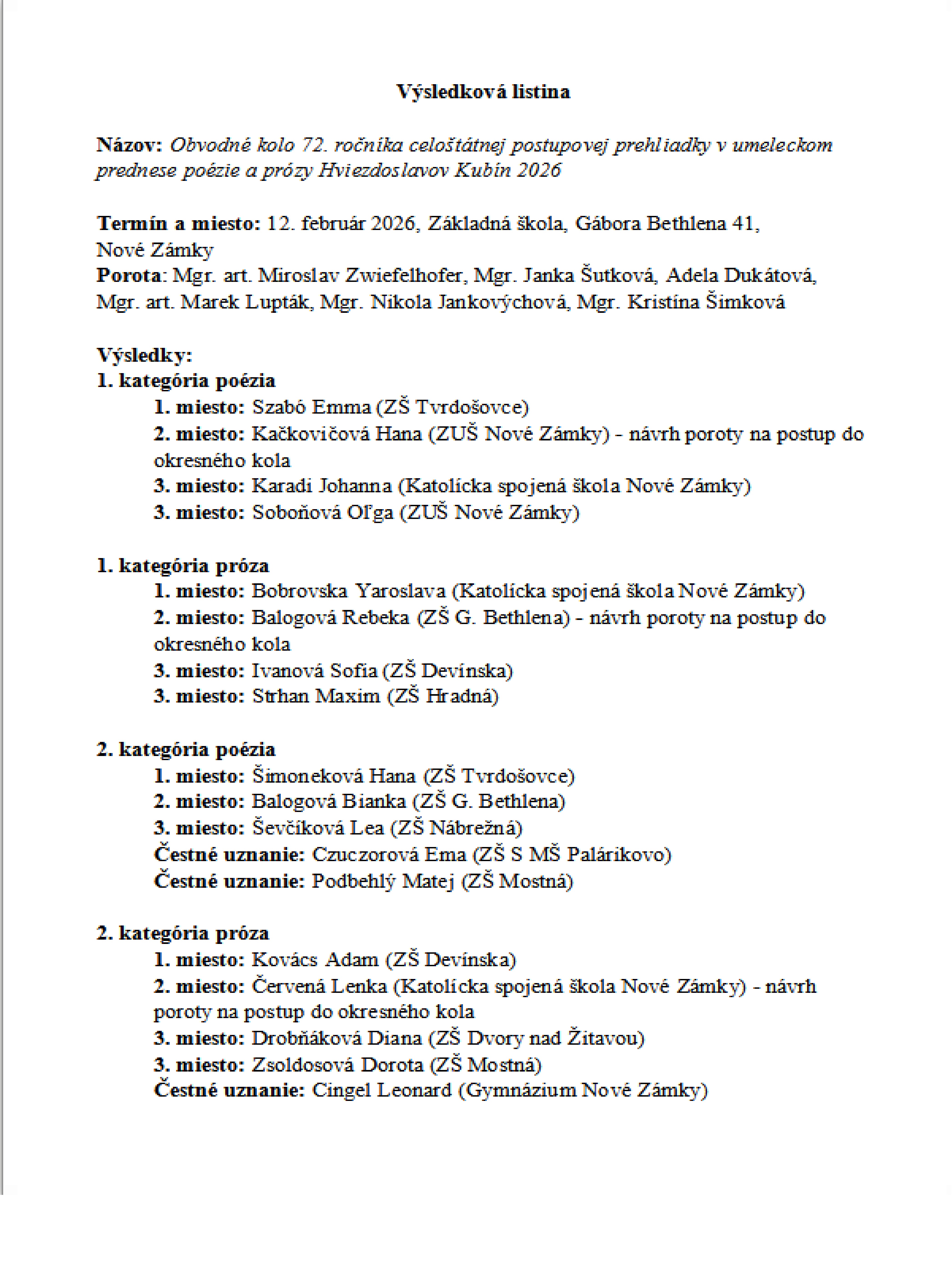 Hviezdoslavov Kubín obvodné kolo Nové Zámky 2026