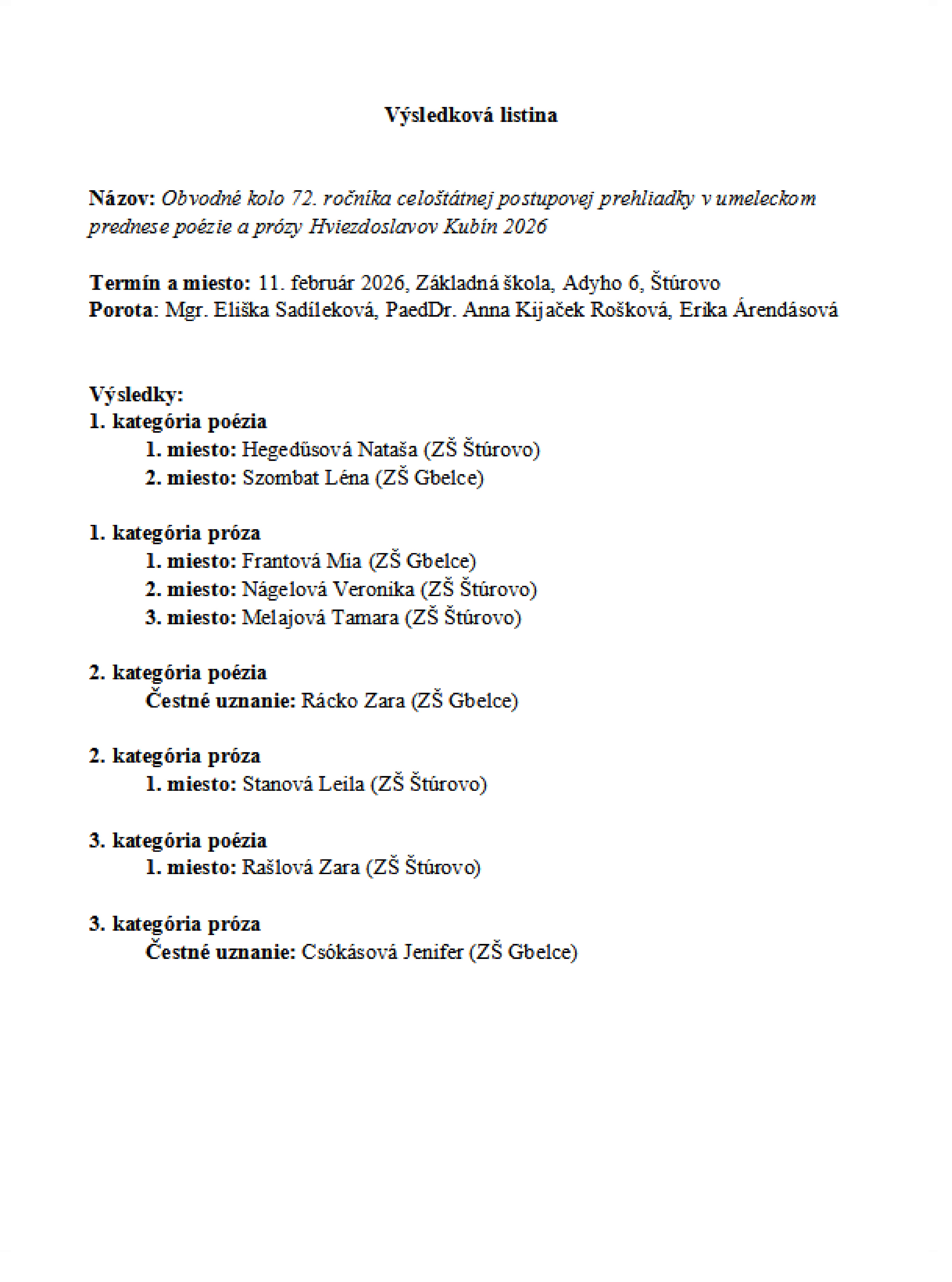 Hviezdoslavov Kubín obvodné kolo Štúrovo 2026